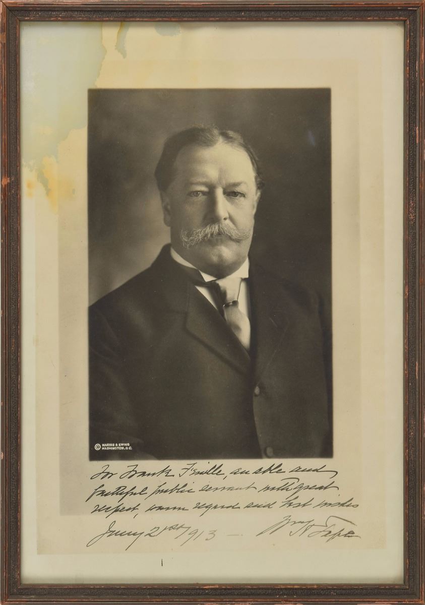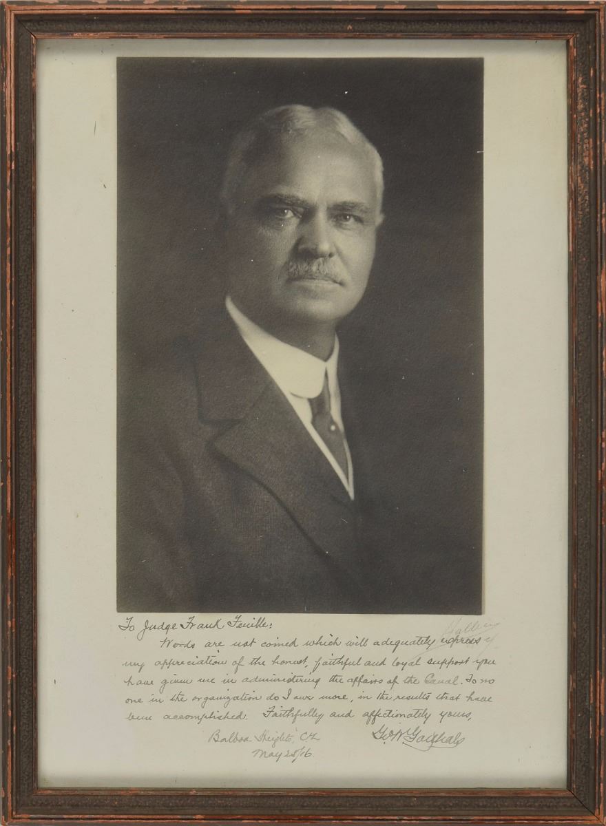 Two vintage photos: a matte-finish 9.25 x 13.5 portrait of Taft by Harris & Ewing, signed and inscribed in black ink as president, "For Frank F'euille, an able and faithful public servant with great respect, warm regard and best wishes, Wm. H. Taft," who adds the date, "Jany. 21st, 1913"; and a matte-finish 7 x 9.75 portrait of George Washington Goethals, lengthily signed and inscribed in the lower border in black ink, "To Judge Frank Feuille, Words are not coined which will adequately express my appreciation of the honest, faithful and loyal support you have given me in administering the affairs of the Canal. To no one in the organization do I owe more, in the results that have been accomplished. Faithfully and affectionately yours, Geo. W. Goethals, Balboa Heights, C. Z., May 25/16." Both are individually framed. Goethals is in fine condition; Taft is very good, with light rippling, a spot of silvering to the image, and obvious staining to the upper left from onetime exposure to moisture. Feuille served as counsel and chief attorney for the Isthmian Canal Commission.