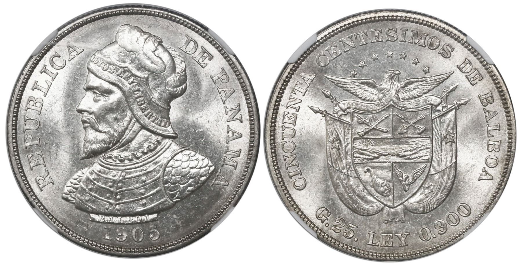 Panama (struck at the Philadelphia mint), 50 centesimos de Balboa, 1905, encapsulated NGC MS 64, ex-