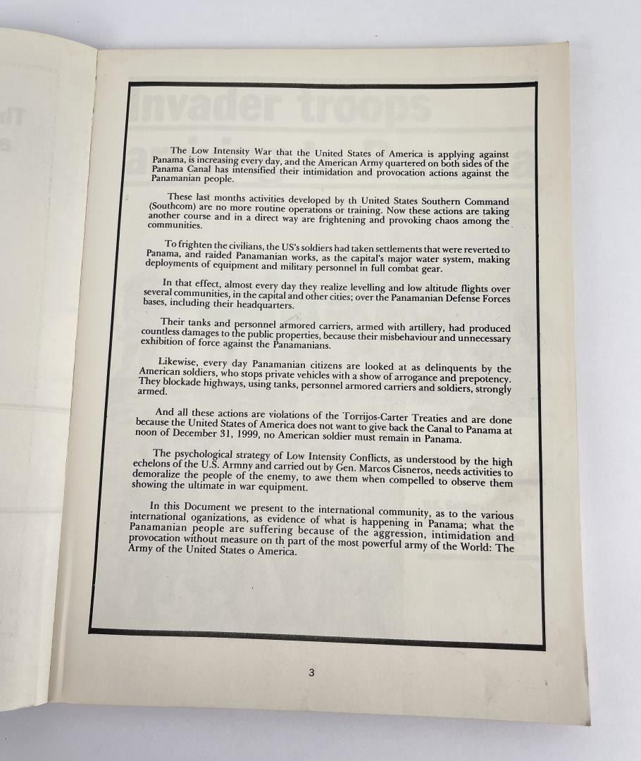 Interesting piece of Panamanian issued propaganda. This is Not Vietnam. This is Panama, a Latin American Country invaded by the United States of America. The armed intimidation and provocation of the US Army against Panama.