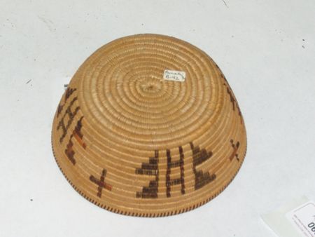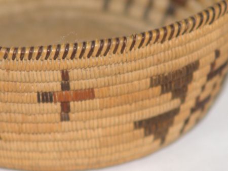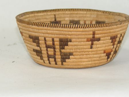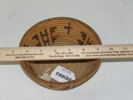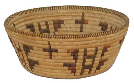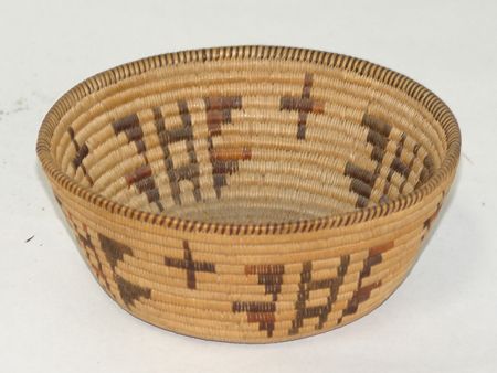 Early 1900s, Smaller very fine weave flared polychrome bowl with rare crosses and butterflies. Very good condition, great patina. 2-1/2" x 6"