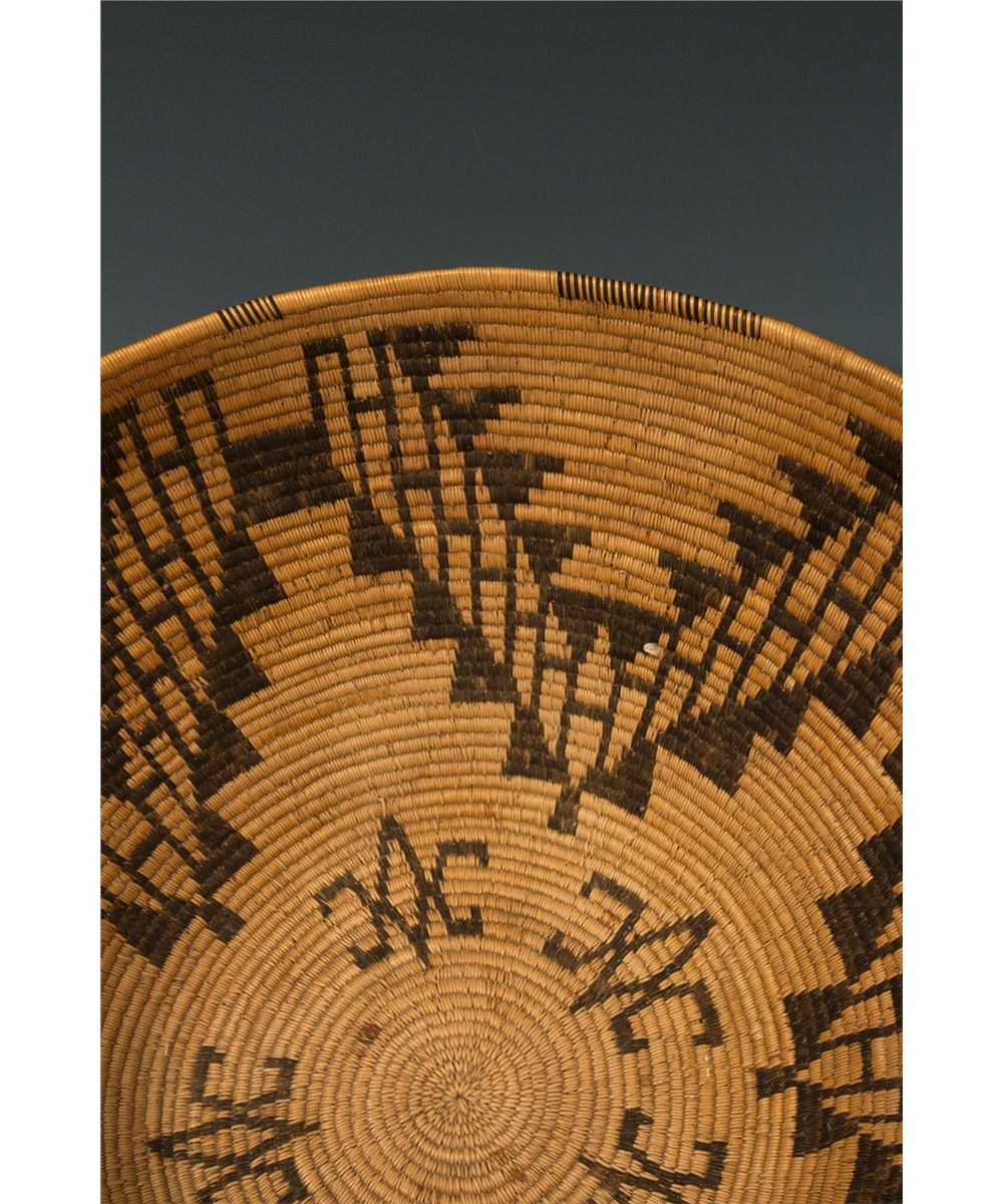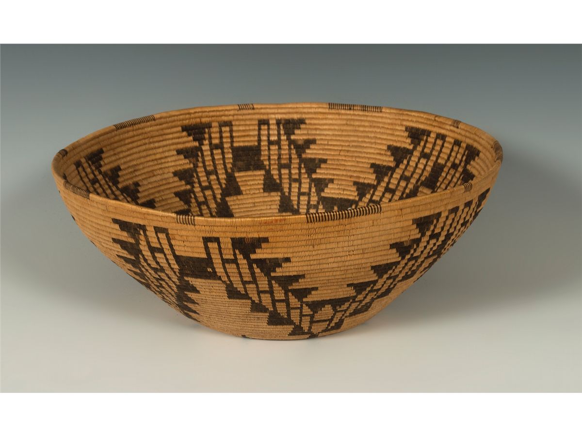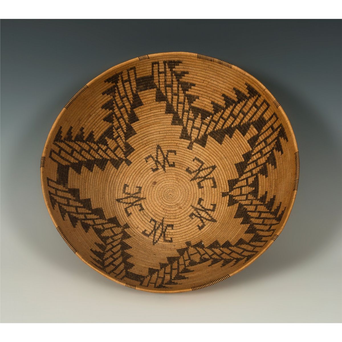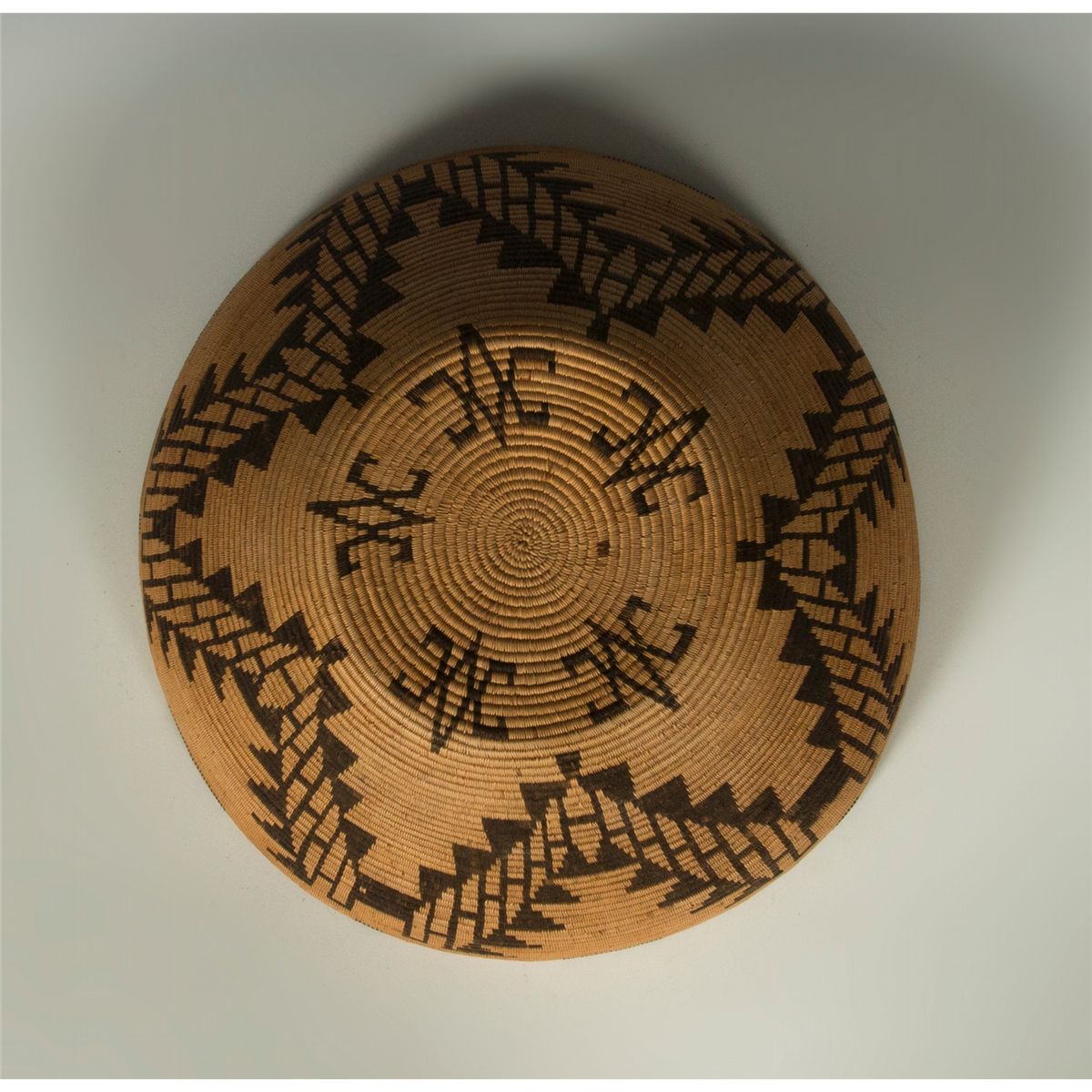 Panamint Basketry Bowl. 12" diameter, 4.5" tall. Finely woven with zigzagging geometric designs. Circa 1930s.