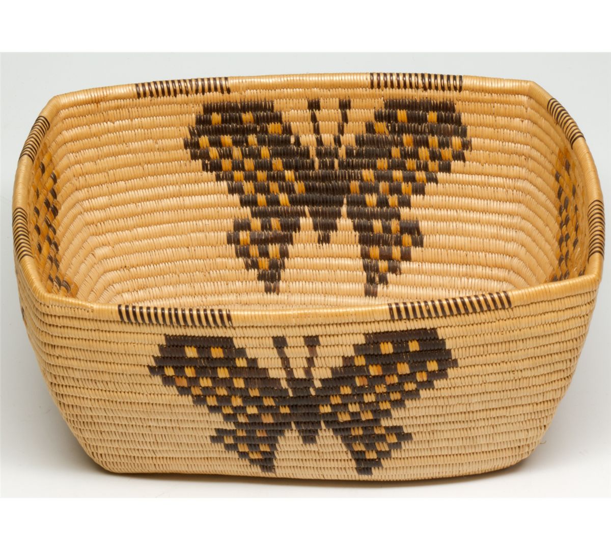 A rectangular shape, measuring 6 x 4.75 x 2.75 tall. Polychrome. There are 30 stitches per inch and the basket is in excellent condition. The weaver is identified as Grandma Ness. Grandma Ness Collection HKA#62129