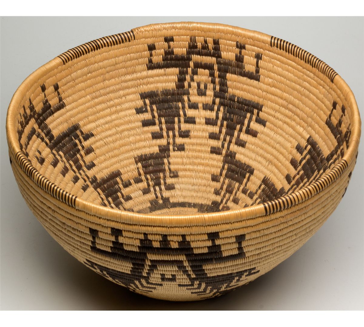 A beautifully made basket with dramatic geometric design encircling the body. There are 4 groups of rim ticks around the top edge. Woven by Grandma in 1954. Measurements are 8.5 diameter x 4.5 in height, with 24 stitches per inch. Excellent condition. Grandma Ness Collection HKA#62164