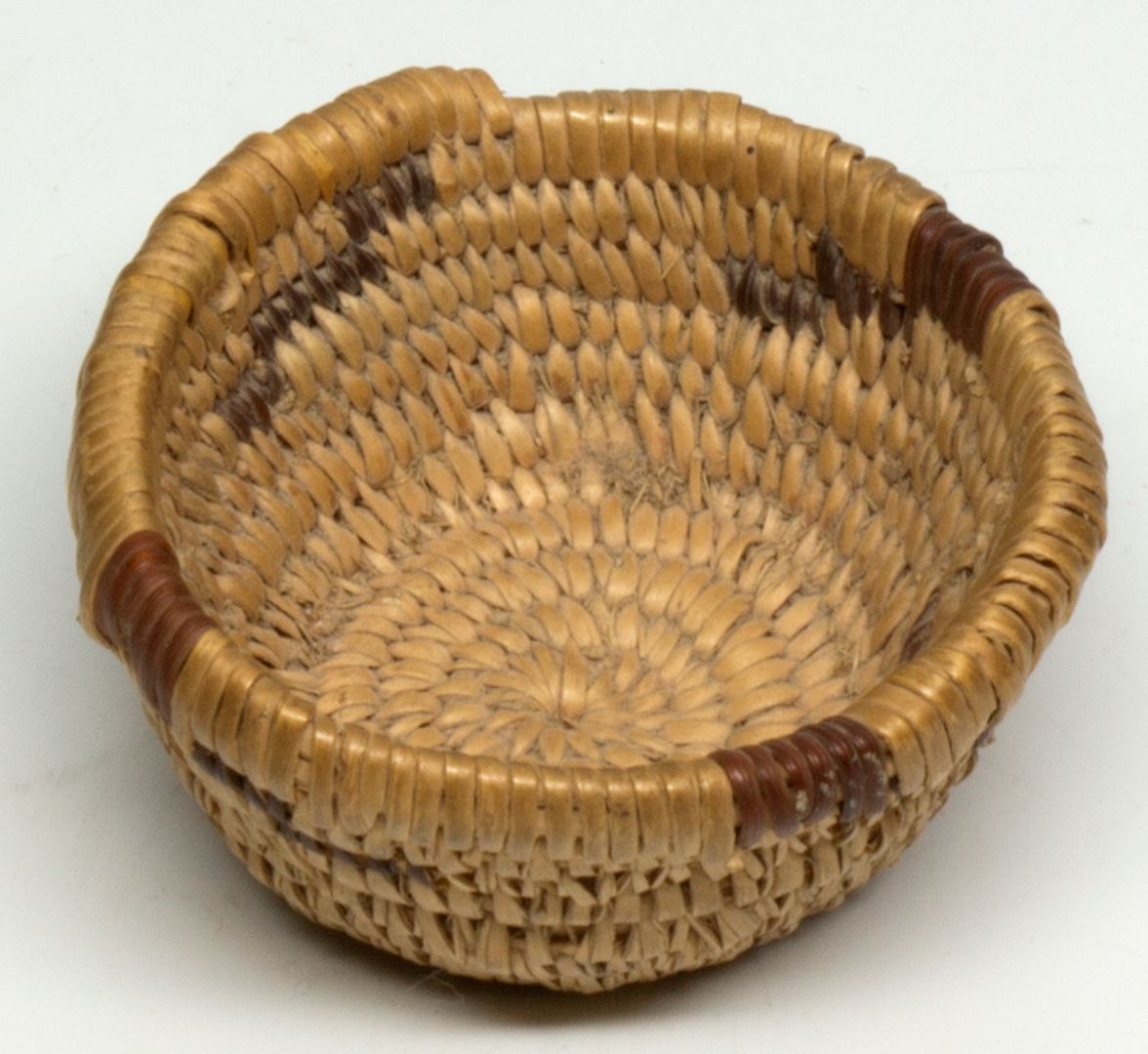A tiny miniature bowl measuring only 2 in diamenter x 1 tall. Woven by Wanona Joquin at age 12. The weaving is a bit irregular. Grandma Ness Collection HKA#62131
