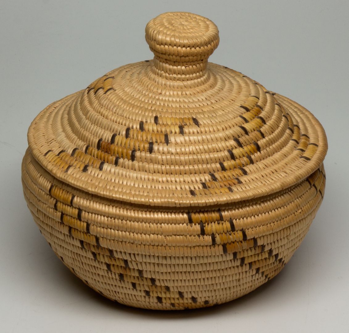 This tri-colored basket has angled stripes of yellow edged with single black stitches on the natural willow ground. The knobbed top lid carries through the same design but with the stripes angling in the opposite direction. Measures 6 x 5.5. Woven by Grandma Ness in 1949.Grandma Ness Collection HKA#62153