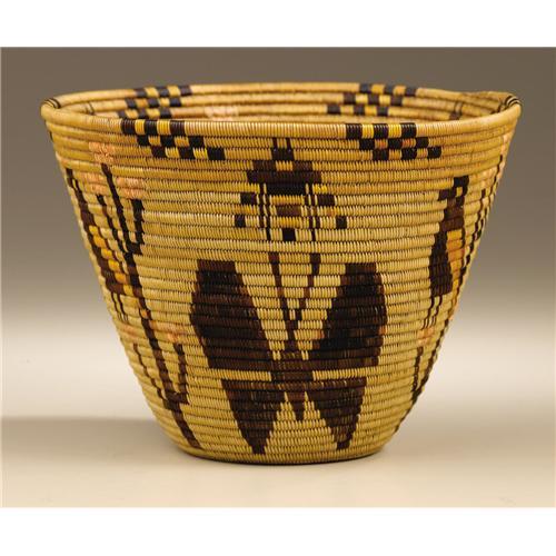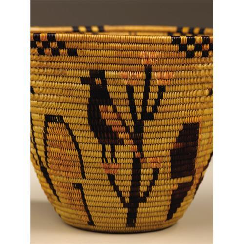 <B>Panamint Polychrome Pictorial Basket</B></I><BR>Circa 1930<BR>Height 5 in. Diameter 7 in.<BR><BR>This fine and tightly woven coiled pictorial basket is decorated with large butterflies, bees, and birds perched on trees. "One aspect of coiled Panamint Shoshone basketry is its great diversity in form and design. Dramatic historical changes in the northern Mojave Desert, which began in the latter half of the 19th century with the arrival of miners, settlers, and eventually tourists, encouraged the creation of a new basket style, which more closely reflected the taste of the new Californians. The gradual transformation of basketry with geometric design made for the Indian's own use, to eventually small, colorful vessels with bird and butterfly illustrations made for the tourist trade was inevitable, because, as society changes, so will its art form."<BR><BR>Provenance<BR>Sandra Horn, Mill Valley, California.<BR><BR>Reference<BR>Slater, Eva, <I>Panamint Shoshone Basketry,</B></I> Sagebrush Press, Morongo Valley, California, 2000, p. 27.<BR><BR>