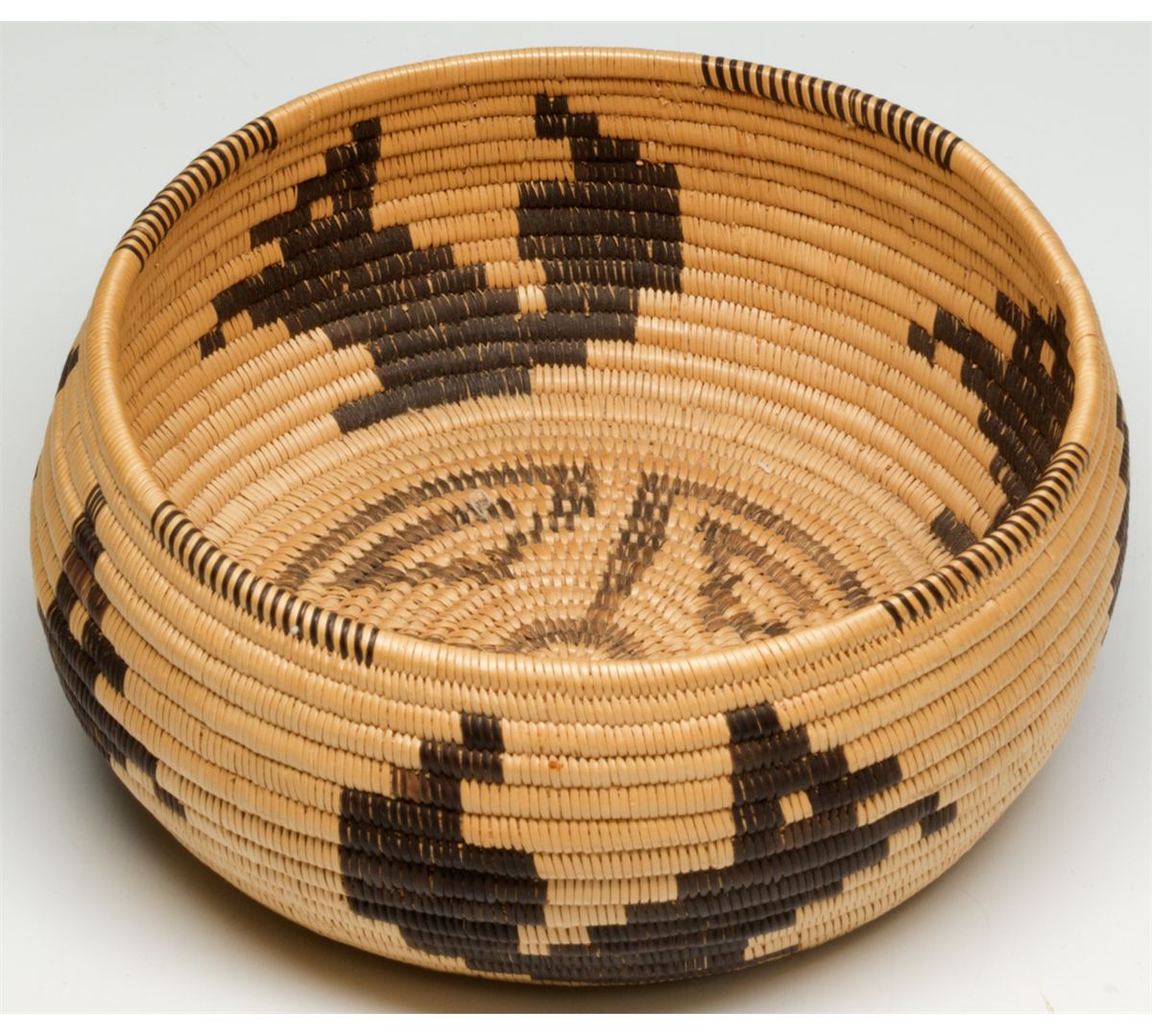 Another Grandma basket from 1939 with 4 squirrels around the body of the basket and a geometric maze design on the bottom.Measurements: 6 diameter x 2.75 height. Excellent condition. Grandma Ness Collection HKA#62168