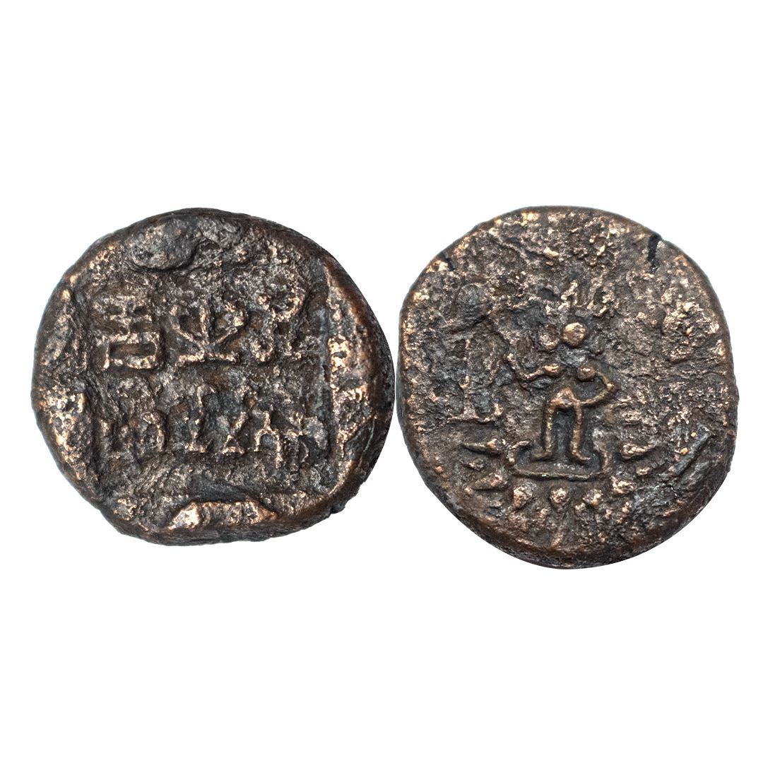 Panchala Dynasty, Phalgunimitra, Heavy Copper Alloyed Unit, 14.43Grms, OBV: Three royal symbol of Panchala and below Brahmi legend ‘Phagunimitasa’, REV: Phalguni standing on lotus with one hand raised beside srivatsa symbol. (Pieper # 1360). Fine.