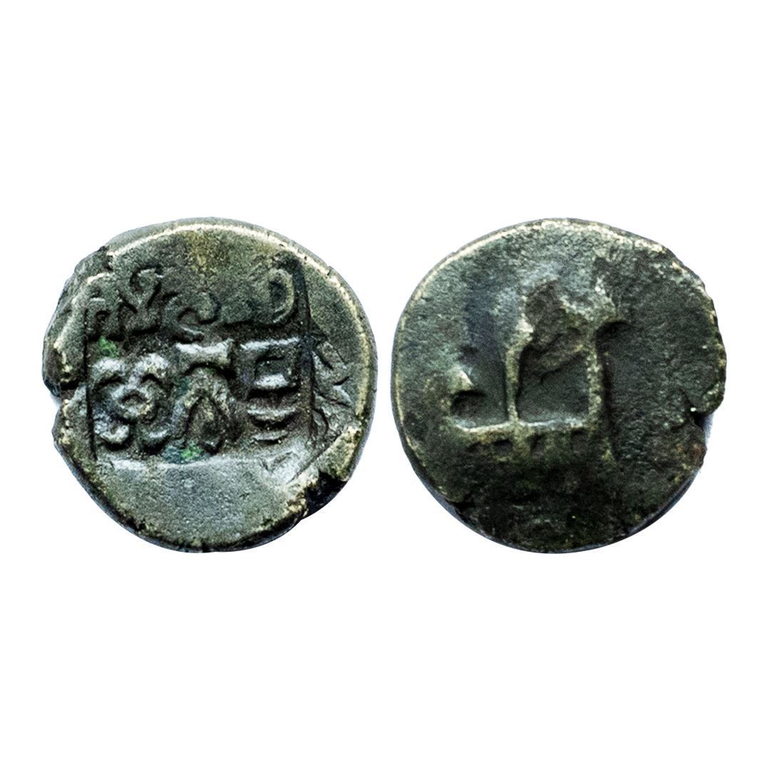 Panchalas of Ahichchhatra, Dhruvamitra, Copper Based Alloy, 5.02Grms, Obv: Royal symbol of panchala on top and below Brahmi legend ‘Dhruvamitrasa’, Rev: Curved symbol on pedestal. (Pieper # 1367).Fine+.