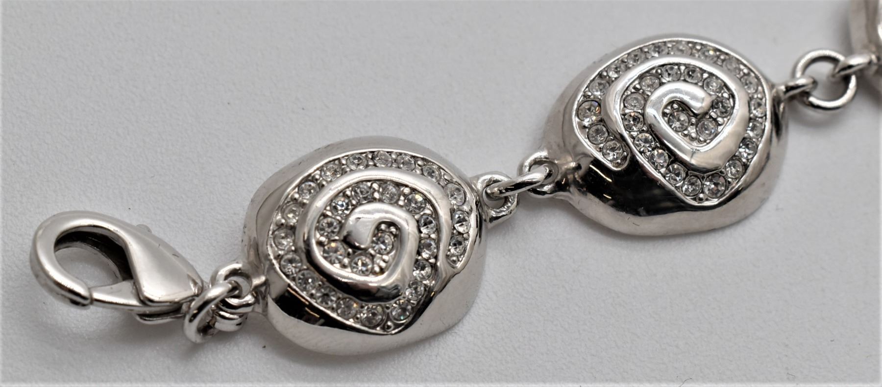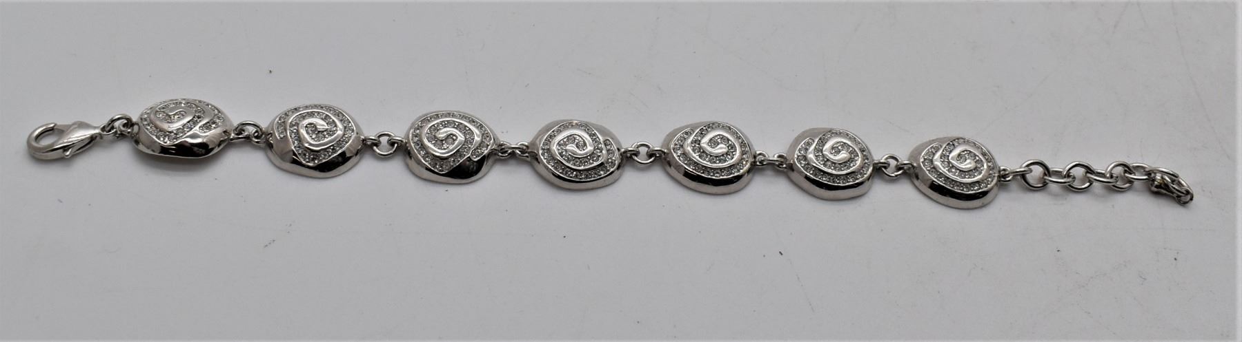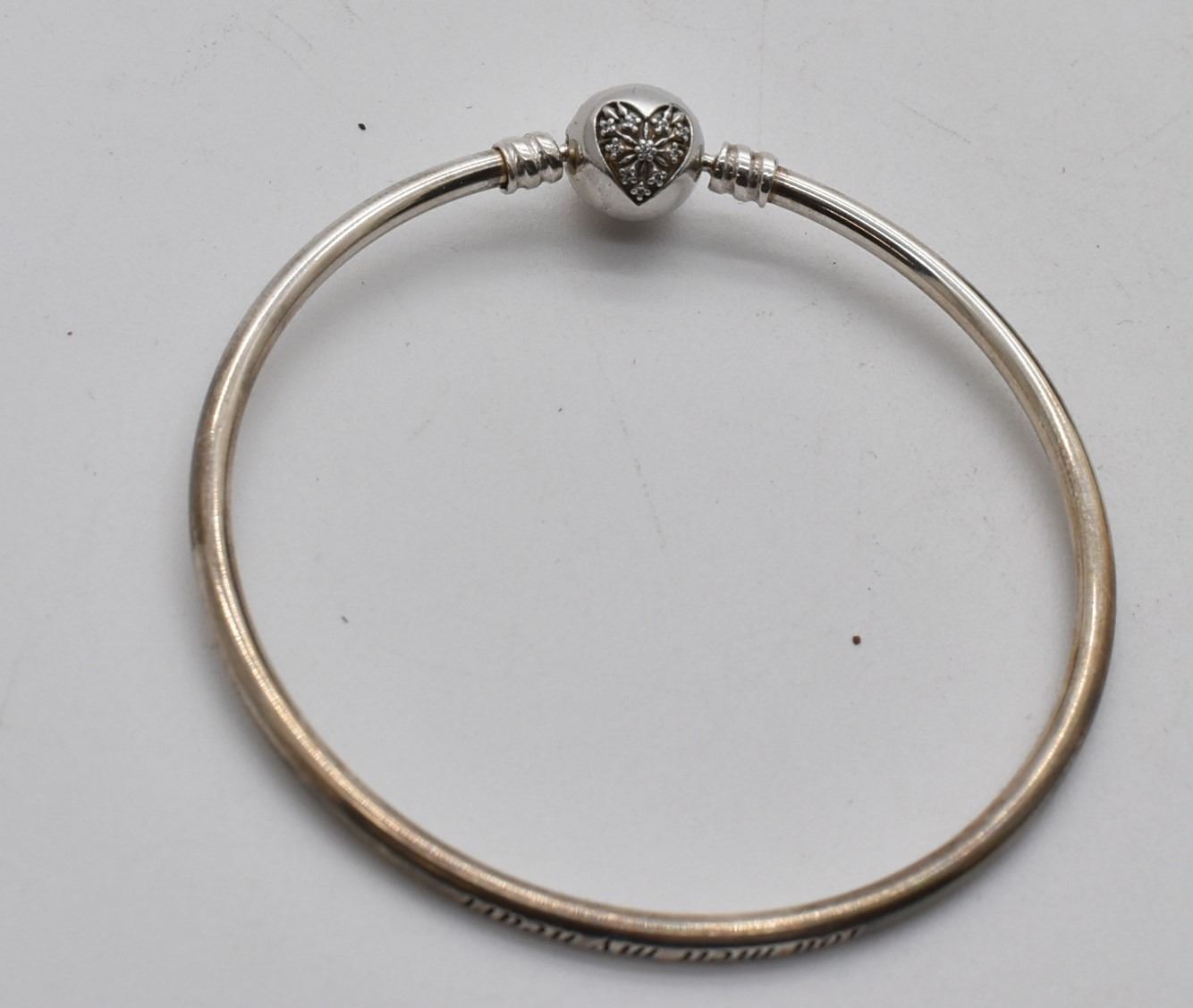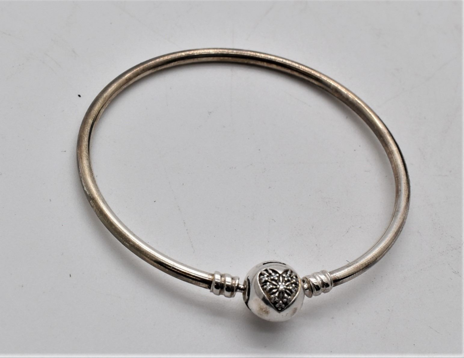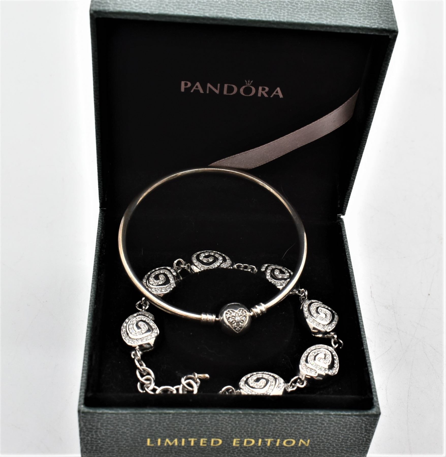 Pandora Sterling Sparkling Heart Barrel Bead Bangle Charm Bracelet, pave' heart, clasp bracelet, marked .925, comes in Pandora box, also included is a rhinestone link bracelet with extender chain, measures 9''L end to end, can be shortened for smaller wrists, marked on back