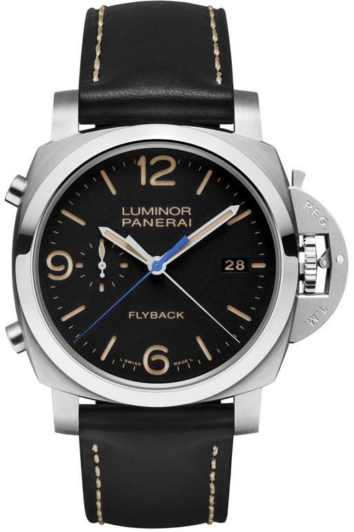 Model: PAM00524 - CASE = [Material:Brushed Steel with Brushed Steel Buttons with Engraving for the Chronograph Functions at 8 and 10 o'clock], [Case Diameter:44], [Bezel:Polished Steel], [Water Resistant:100 Meters - 330 Feet], [Crystal:Sapphire], DIAL = [Color:Black with luminous Arabic numerals and hour markers. Date at 3 o’clock, seconds at 9 o’clock, central chronograph seconds and minutes hands.], MOVEMENT = [Type:Automatic Self Winding Mechanical], [Crown:Screw Down], BAND = [Clasp:Trapezoidal brushed steel buckle], [Type:Black Leather], (In Stock - Ready to ship.)