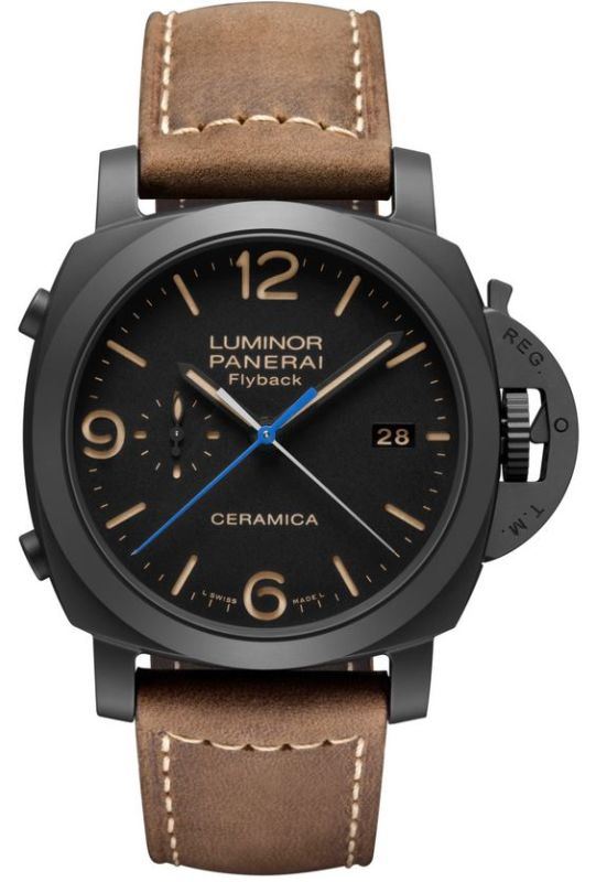 Model: PAM00580 - CASE = [Material:Ceramic], [Case Diameter:44], [Bezel:Fixed], [Case Back:Skeleton], [Water Resistant:100 Meters - 330 Feet], [Crystal:Scratch Resistant Sapphire], DIAL = [Color:Black], MOVEMENT = [Type:Automatic], [Crown:Screw Down], BAND = [Clasp:Tang], [Type:Brown Leather], (Usually ships in 1 to 2 business days.)