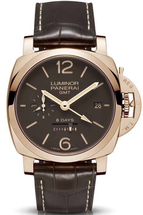 Model: PAM00576 - CASE = [Material:18kt Rose Gold], [Case Diameter:44], [Bezel:Fixed], [Case Back:Skeleton], [Water Resistant:50 Meters - 165 Feet], [Crystal:Scratch Resistant Sapphire],; DIAL = [Color:Brown],; MOVEMENT = [Type:Automatic], [Crown:Screw Down],; BAND = [Clasp:Tang], [Type:Brown Alligator Leather], (Usually ships in 1 to 2 weeks.)