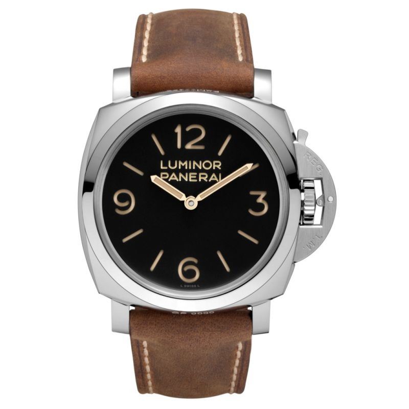 Model: PAM00372 - CASE = [Material:Stainless Steel], [Case Diameter:47], [Case Back:See-thru Sapphire Crystal], [Water Resistant:100 Meters/ 330 Feet], [Crystal:Plexi Glass],; DIAL = [Color:Black],; MOVEMENT = [Type:Manual Winding],; BAND = [Clasp:Tang], [Type:Brown Leather], (In Stock - Ready to ship.)