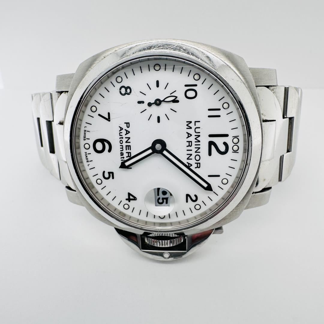 This Panerai Luminor Marina Automatic features a stainless steel 44mm case with the signature crown-protecting bridge. The white dial is accented by luminous Arabic numerals, a date display at 3 o'clock, and a small seconds subdial at 9 o'clock. Offered with its original box and papers, this timepiece embodies Panerai's bold design and Swiss precision, making it highly desirable for collectors.