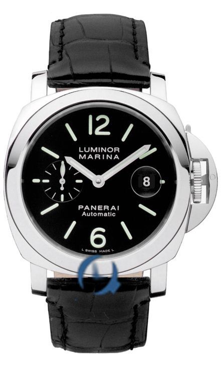 Model: PAM00104 - Case,; MATERIALSTAINLESS STEEL = [Case Diameter44], [Case Thickness15.6mm], [BezelFixed], [Case BackSolid], [Water Resistant300 Meters/1000 Feet], [CrystalScratch Resistant Sapphire], Dial,; COLORBLACK = Movement,; TYPEAUTOMATIC SELF WINDING = [CrownStainless Steel], Band,; CLASPDEPLOYMENT BUCKLE = [TypeBlack Alligator Leather], (In Stock - Ready to ship.)