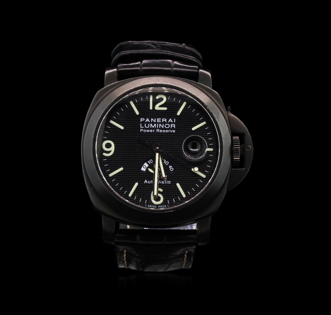 One, Panerai Luminor Power Reserve PVD wristwatch electronically tested stainless steel, Case: 43mm, PVD finish, water resistant to 300 meters / 1000 feet, Crown: set within the signature Panerai crown protector, Crystal: synthetic sapphire, Swiss Movement: Panerai Automatic, Power Reserve: Forty Two Hours. PVD is short for Physical Vapor Deposition. This is a chemical process that creates a very durable tarnish resistant finish, similar to highly polished brass. PVD finish is commonly used for watch cases. Signed Dial: Black Hobnail; with luminous pointed hands, numerals, and indices; Date Window: 3 o'clock position, Power Reserve Window: 6 o'clock position. Panerai Bracelet: Black saddle stitched leather strap, Condition: G-5 Fine. Eight and one half inch length, adjustable. Panerai PVD buckle. Total Weight of Watch 136.50gm. AIG Appraised at $10,050.00.