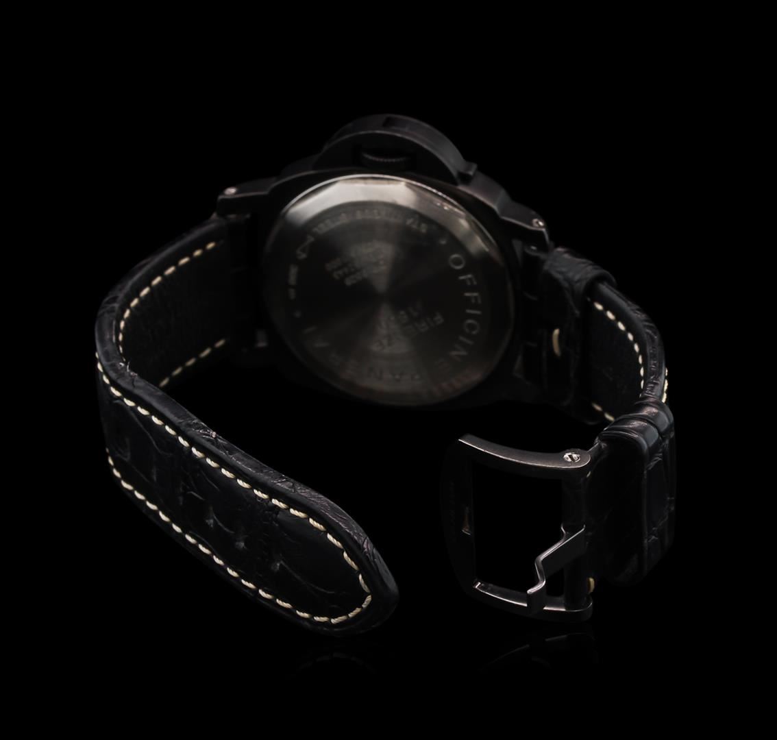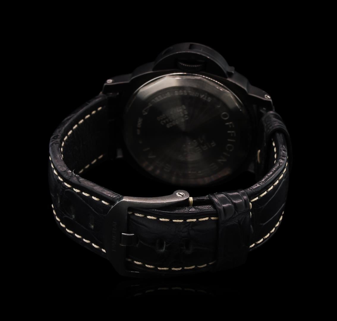 One, Panerai Luminor Power Reserve PVD wristwatch electronically tested stainless steel, Case: 43mm, PVD finish, water resistant to 300 meters / 1000 feet, Crown: set within the signature Panerai crown protector, Crystal: synthetic sapphire, Swiss Movement: Panerai Automatic, Power Reserve: Forty Two Hours. PVD is short for Physical Vapor Deposition. This is a chemical process that creates a very durable tarnish resistant finish, similar to highly polished brass. PVD finish is commonly used for watch cases. Signed Dial: Black Hobnail; with luminous pointed hands, numerals, and indices; Date Window: 3 o'clock position, Power Reserve Window: 6 o'clock position. Panerai Bracelet: Black saddle stitched leather strap, Condition: G-5 Fine. Eight and one half inch length, adjustable. Panerai PVD buckle. Total Weight of Watch 136.50gm. AIG Appraised at $10,050.00.