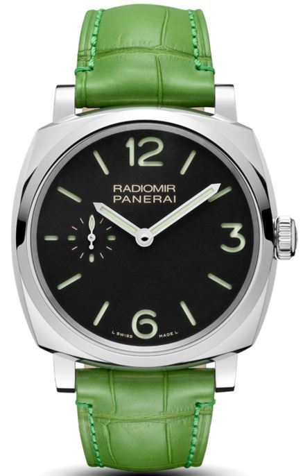 Model: PAM00574 - CASE = [Material:Polished Stainless Steel], [Case Diameter:42], [Bezel:Fixed], [Case Back:Skeleton], [Water Resistant:100 Meters - 330 Feet], [Crystal:Scratch Resistant Sapphire], DIAL = [Color:Black with Luminous Arabic Numerals and Hour Markers. Small Seconds at 9 o'clock], MOVEMENT = [Type:Self Winding Automatic, Calibre, 3 Day Power Reserve, Anti-Shock], [Crown:Screw Down], BAND = [Clasp:Tang], [Type:Green Alligator Leather], (In Stock - Ready to ship.)