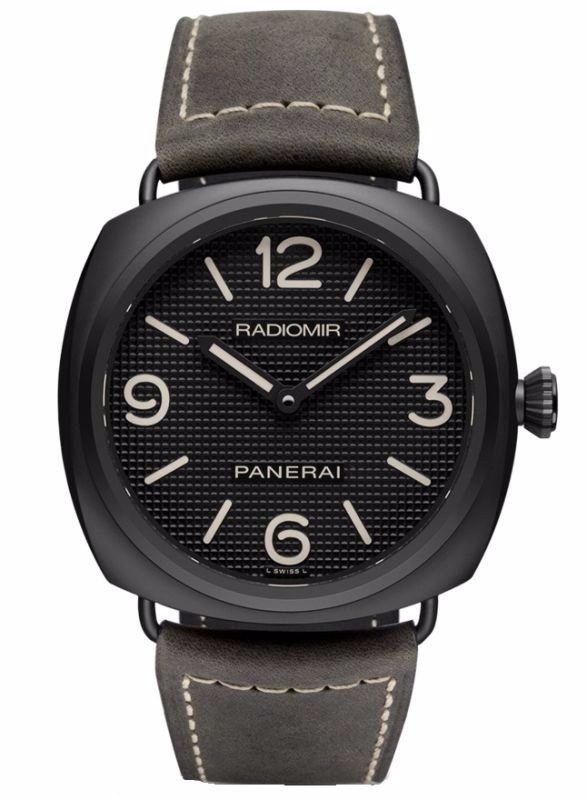 Model: PAM00643 - CASE = [Material:Matt Black Ceramic], [Case Diameter:45], [Bezel:Fixed], [Case Back:Solid], [Water Resistant:100 Meters - 330 Feet], [Crystal:Scratch Resistant Sapphire],; DIAL = [Color:Black with Paris Hobnails with Luminous Arabic Numerals and Hour Markers],; MOVEMENT = [Type:Self Winding Automatic, Calibre, 56 Hour Power Reserve], [Crown:Screw Down],; BAND = [Clasp:Tang], [Type:Calfskin Leather], (Usually ships in 1 to 2 business days.)