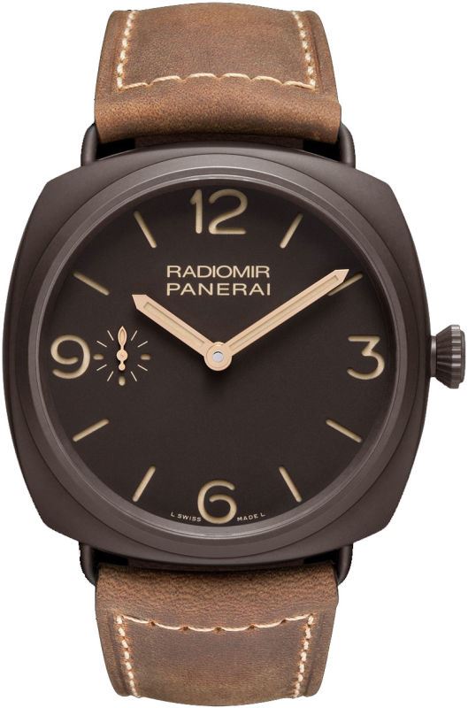 Model: PAM00504 - CASE = [Material:Brown Ceramic], [Case Diameter:47], [Case Back:See-thru Sapphire Crystal], [Water Resistant:100 Meters/ 330 Feet], [Crystal:Scratch Resistant Sapphire Crystal], DIAL = [Color:Brown], MOVEMENT = [Type:Manual Winding], BAND = [Clasp:Tang], [Type:Brown Leather], (In Stock - Ready to ship.)