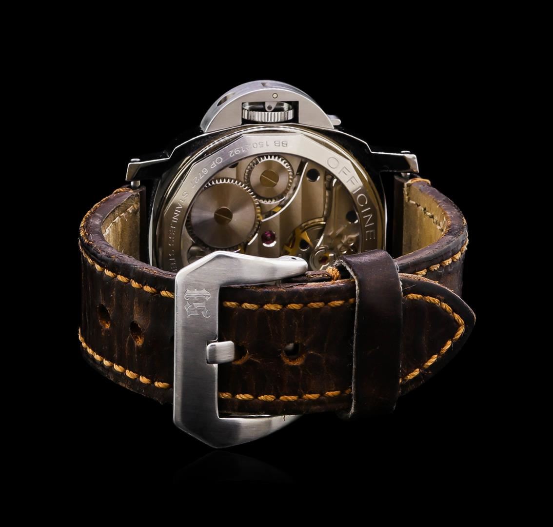 One, Panerai Luminor Base wristwatch electronically tested stainless steel, Case: 44mm, Water Resistant 100 meters / 330 feet, Exhibition Case Back: sapphire lens, Case Back Frame: engraved with the manufacturers name, Series & Case numbers, and additional information, Fixed Bezel: polished, Crown: signature crown protector, Crystal: Anti-Reflective Sapphire lens. Panerai Movement: stem wind mechanical. Dial: Black, with luminous hands, luminous numerals and luminous indices, Bracelet: saddle stitched leather strap, Condition: G-6 Extra Fine. Eight inch length, adjustable. Total Weight of Watch132.76gm. AIG Appraised at $6,050.00.