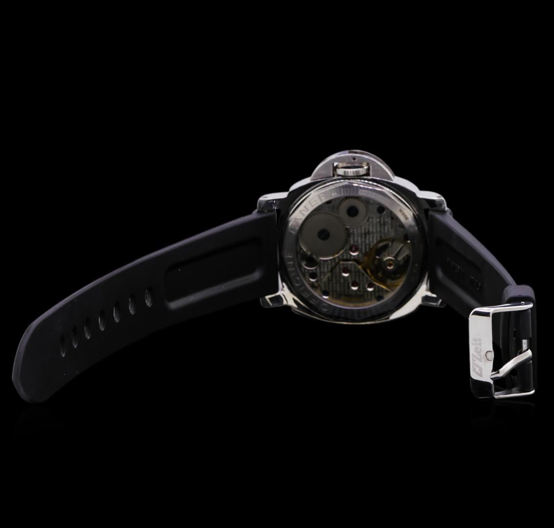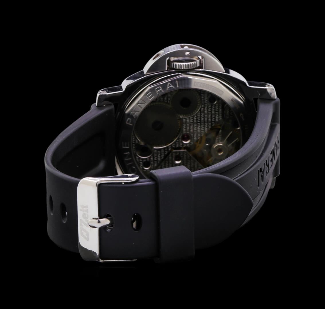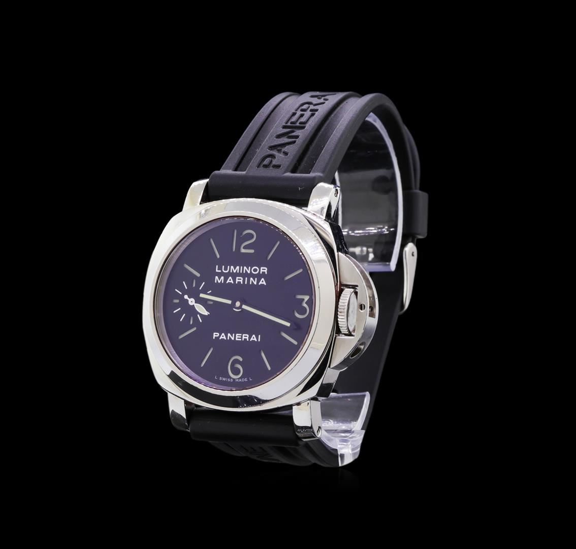 One Panerai Luminor Marina watch featuring: Case: Stainless steel; see-through sapphire crystal back. Bezel: Stainless steel. Dial: Black color; luminous hour and minute hands; luminous Arabic numerals and hour markers. Functions: Seconds sub-dial located at the 9 o'clock position. Bracelet: Black rubber with stainless steel buckle clasp.