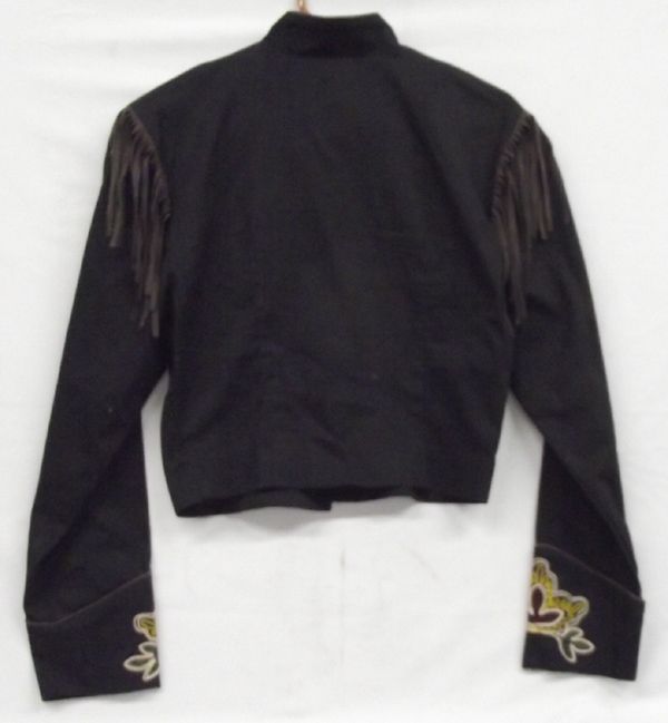 Panhandle Slim Women's Western Embroidered Blouse, black tan maroon sage and yellow embroidered floral embellishments on front of black fringed blouse, has metal buttons, same embroidery on both sleeves, size M