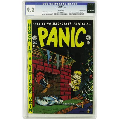 <B>Panic #1 Gaines File pedigree (EC, 1954) CGC NM- 9.2 White pages.</B></I> Used in Senate Investigation hearings, and banned in Massachusetts due to Al Feldstein's cover and "Night Before Christmas" parody poem. Also features a Mickey Spillane parody. Art by Jack Davis, Joe Orlando, Bill Elder, and Jack Kamen. CGC has certified this as a Gaines File Copy, but no certificate accompanies the lot. Overstreet 2006 NM- 9.2 value = $465. CGC census 3/06: 3 in 9.2, 3 higher.