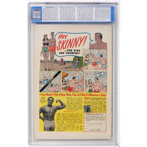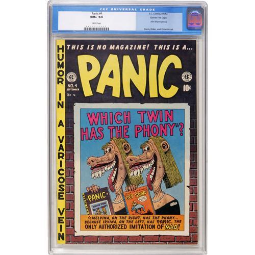 <B>Panic #4 Gaines File pedigree (EC, 1954) CGC NM+ 9.6 White pages.</B></I> The companion title to <B>Mad </B></I>gave EC's creative writers and artists another vehicle to vent their craziness. Basil Wolverton's cover was typically humorous and disturbing at the same time. Jack Davis, Bill Elder, and Joe Orlando helped with interior artwork for this issue, which had a John Wayne parody. While CGC has certified this as a Gaines File Copy, no certificate accompanies the book. Overstreet 2006 NM- 9.2 value = $180. CGC census 3/07: 2 in 9.6, 1 higher. <BR><BR><b>Shipping:</b> Comics - Slabbed (certified) (<a target=""_blank"" href=""http://www.heritageauctions.com/common/shipping.php"">view shipping information</a>)