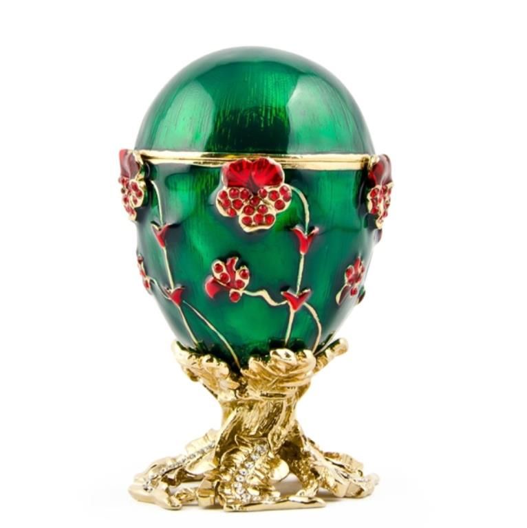 In nephrite adorned with enameled red pansies covered with a set with diamonds, supported on a swirl of leaves in golden gilt set with diamonds. The inside is covered with a green enameled surface in a wavy pattern. Grace, beauty and style is demonstrated with this pansy egg. 2.5'' (H) X 1.5'' (D) Pewter, Enamel, Crystals Egg The 1899 Pansy Egg, formerly known as "Spinach Jade Egg", is made of nephrite, silver-gilt, diamonds, white, red, green and opaque violet enamel. The heart surprise is made of varicolored gold, diamonds, rose-cut diamonds, pearls, strawberry enamel, white enamel and mother of pearl. This Egg stands on an bunch of golden twisted leaves from which stem five flowers and five buds of pansy enameled in violet in various nuances. In 1930 one of the ten Eggs sold by the Antikvariat to the Hammer Galleries, New York. 1947 First Egg bought from the Hammer Galleries by Matilda Geddings Gray, oil heiress, New Orleans, Louisiana. Given to her niece, Mrs. Matilda Gray Stream of New Orleans, Louisiana as a wedding anniversary present. The Pansy Egg is one of the few significant Imperial Eggs to remain in a private collection.