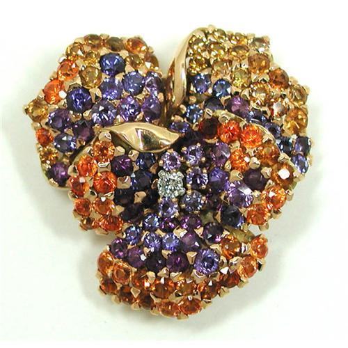 Glittering pansy floral brooch. Five pierced 14Kt gold (tested, not marked) petals form a pansy blossom. The petals are covered with prong-set deep purple amethysts and yellow-to-orange topazes around a central diamond. Two-prong hinged closure on reverse. Two-prong hinged closure on reverse.
