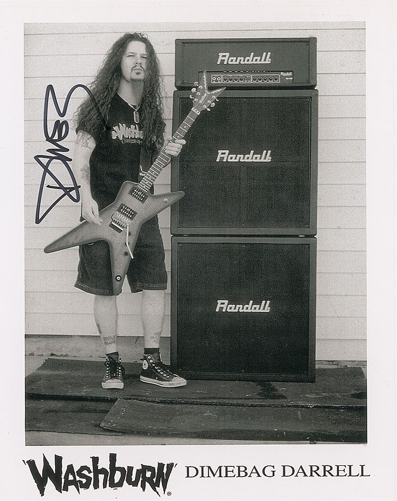 Guitarist and founding member of Pantera and Damageplan, who was murdered on stage on December 8, 2004. Scarce 8 x 10 cardstock Washburn guitars promotional photo of ‘Dimebag’ standing in front of a stack of amps, signed vertically in black felt tip. In fine condition.