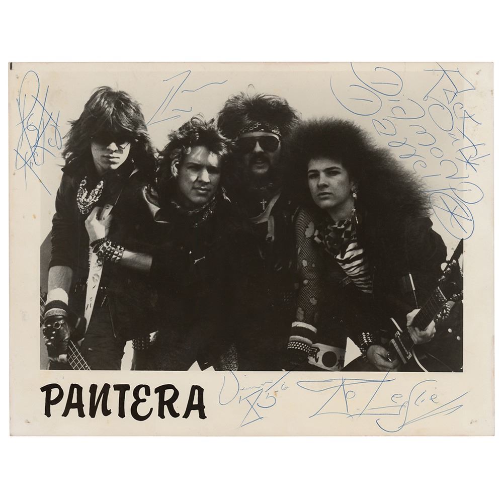 Super early glossy 10 x 8 publicity photo of Pantera, signed in blue ballpoint by Terry Glaze, Dimebag Darrell as Diamond Darrell, Rex Brown as Rex Rocker, and Vinnie Paul, who adds the inscription "To Leslie." In very good to fine condition, with tack holes to the corners, and scattered scuffs and stains.