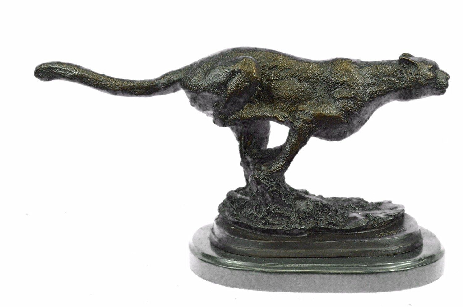 This amazingly detailed sculpture portrays the Cheetahs stride beautifully as he transitions his paws and his weight while running. His facial expression shows calm, cool, and collected concentration while in pursuit. A suiting soft brown patina highlights the muscles on the cheetah's legs, paws, head. The head of the cheetahs is beautifully detailed right down the shape of the skull, jaw line, ears and facial structure. This bronze sculpture was casted using the Lost was Method. This Sleek and Graceful piece is perfect for the wildlife lover in you. Bronze Dimensions with Marble Base: Height 10 X Width 16 inches. Weight: 15 LBS. Inventory: 164059495M61