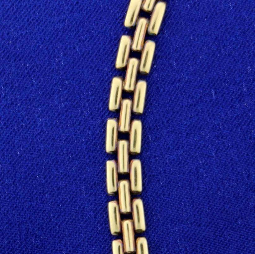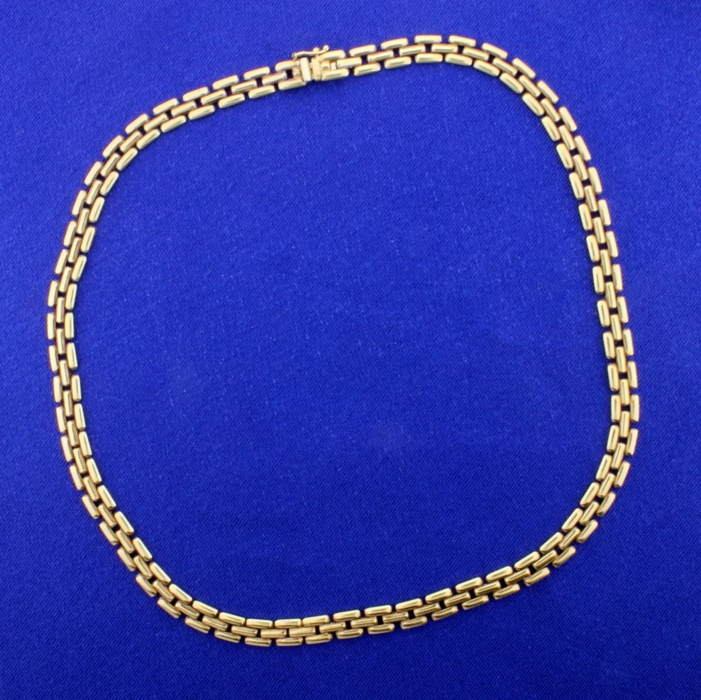 In 14k yellow gold this chain is 16 1/2inches long by 6.3mm wide. It is Italian made with a safety clasp. 29.4g