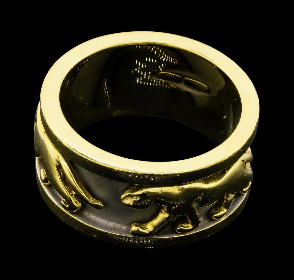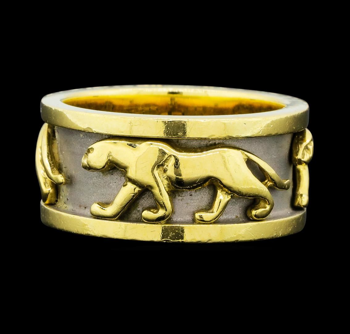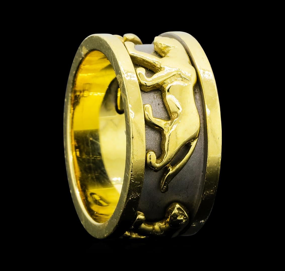 One cast and assembled ring featuring: 14KT yellow gold with white rhodium plating weighing 13.7 grams.