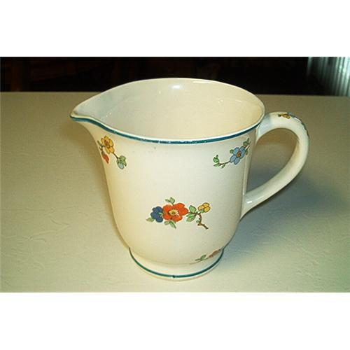 Featuring a Lovely decorated creamer. Bottom states: PANTRY BAK-IN BY WARE - CROOKSVILLE. It is decorated with yellow and blue flowers. The top edge and bottom edge is encrcled with turquoise colored rings. Stands 4 1/2 iinches tall and the base measures 2 3/4 inches in diameter.