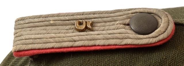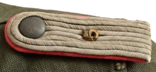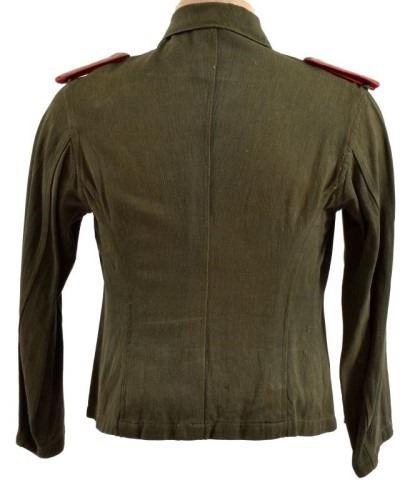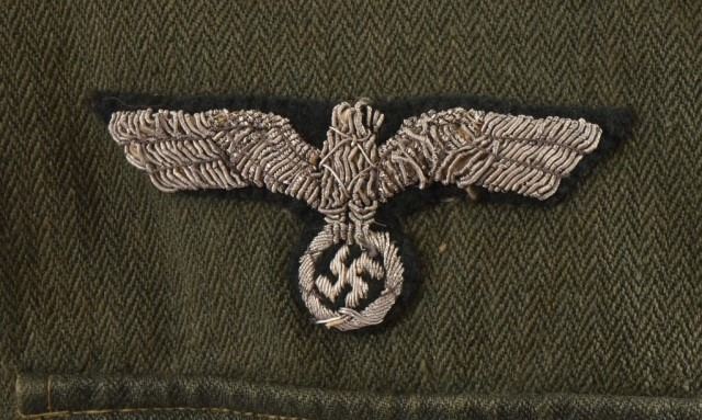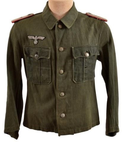 Herring-bone twill, reed-green body and collar. Has silver gray bullion epaulettes with a metal "5" for the 5th Panzer Regiment. Epaulettes have pink Panzer piping, no collar tabs present. Right breast has heavy quality silver bullion Army eagle. Two pleated pockets with flaps, gray painted metal buttons (5 down front of tunic, one on each pocket flap and one on each epaulette). This HBT work jacket belonged to Lt. Rolf Kupfer, who was killed in Russia 1944. Lt. Kupfer served with the 5th Panzer Regiment 5th Light Division AFRIKA KORPS (later renamed 21st Pz Div.), first as a sergeant, then a Lt. throughout the entire North African Campaign, and towards the end was wounded and evacuated to Germany.