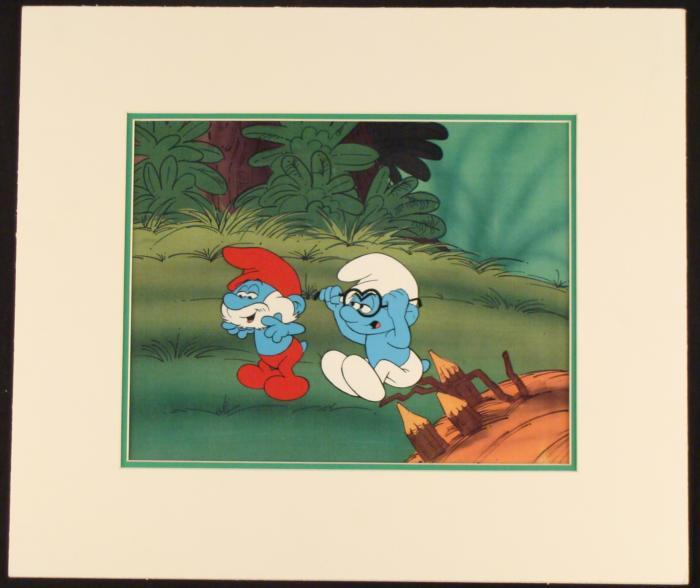 This is an original animation production cel from the 1980's television series The Smurfs. Here we have Papa Smurf along with his apprentice Brainy Smurf who seems to be adjusting his glasses. Medium: Hand painted image on acetate cel; printed background Matting: Double matted in green and whiteImage area: 9 x 11 1/2 inches Matte size: 15" x 17 1/2" Condition: ExcellentThis scene appeared on Saturday morning cartoons back in the heyday of Smurfs. The cel makes a unique Smurf collectible, ready to frame.