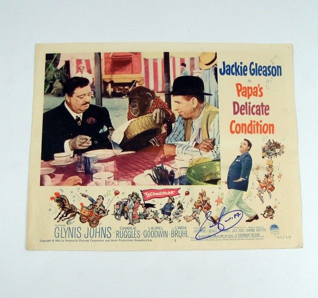 The history of the geneses of the classic hit song "Call Me Irresponsible", composed by Jimmy Van Heusen with lyrics by Sammy Cahn is the food of legends. The famous story was that it was originally inspired by and written for Judy Garland as a parody of her well-known "irresponsible" behavior, and she was so upset when she heard it that she refused to sing it. However this isn't quite true (in fact she did eventually sing it on her TV show). Actually it was originally written for Fred Astaire to sing in his starring role of Jack Griffith in the Jack Rose comedy "Papa's Delicate Condition" (1963). In fact, Sammy Cahn personally auditioned the song for Astaire who loved it. Unfortunately, Astaire had to bow out of the production and his part was given to Jackie Gleason, who sang the song. The song of course went on to win the Oscar for Best Original Song at the 36th Academy Awards in 1964, and has become one of the greatest American standards, having been song by virtually ever renowned singer in the world including Jack Jones and Frank Sinatra. This is a rare original theatrical Lobby Card from the movie. It is personally signed by the Sammy Cahn. In excellent condition, the Lobby Card is 11"x14".