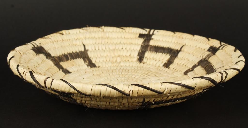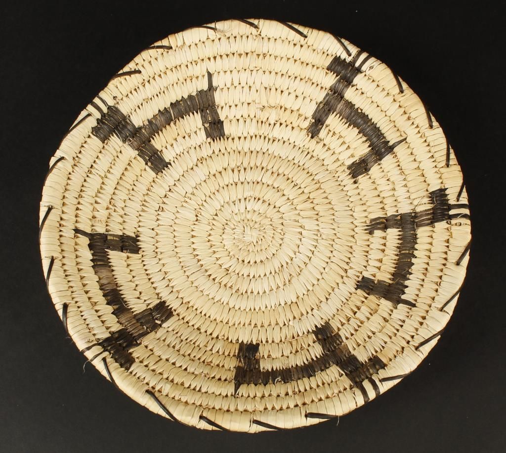 Basketry tray is 2" high and 10" in diameter. Circa 1960's. Condition is overall good.