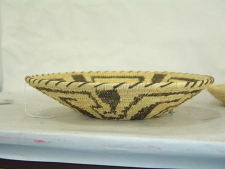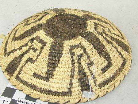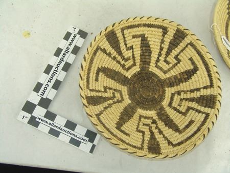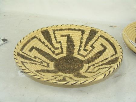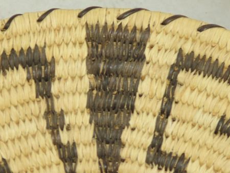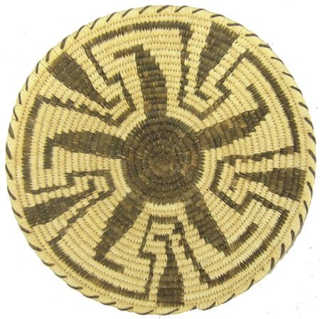 Ca. 1980s, Beautiful sturdy weave Tohono O'odham basketry tray with Pima-style key and blossom design. Excellent condition. 3" x 13"