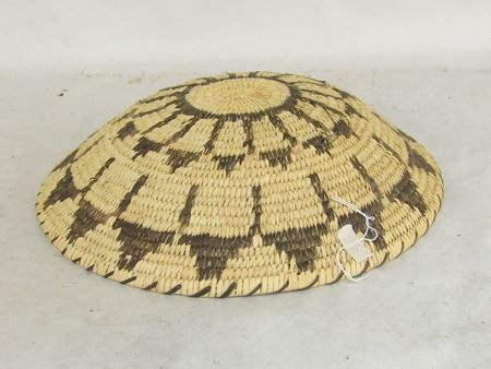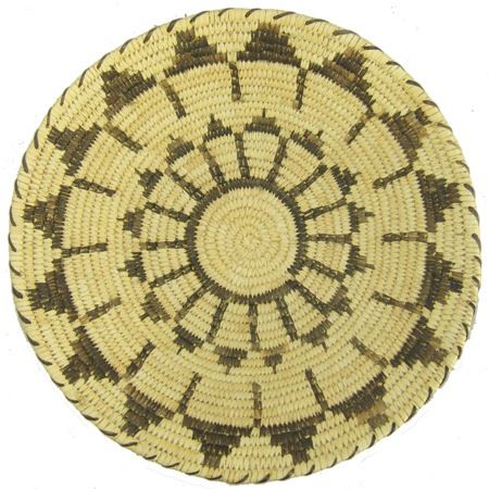 Late 1980s, A wonderful finer weave basketry tray with repeating cloud or structure symbols throughout and done in traditional Tohono O'odham style. Excellent condition. 3" x 12"