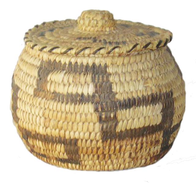 Circa 1960, Vintage lidded polychrome basket. 5-1/4" x 7"