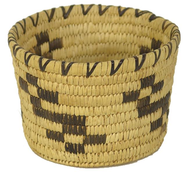 Mid/Late 1900s, Traditional straight-sided basket with flat bottom and interesting geometric form; very good condition. 5" x 7"