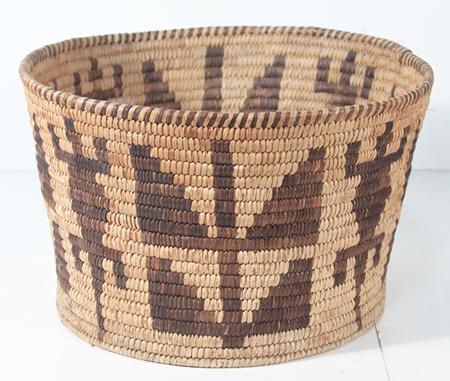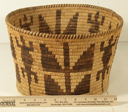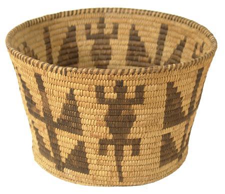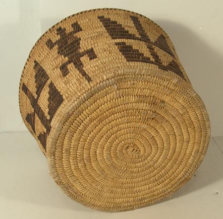 Unique flared basketry bowl with Gila monster and cornstalk figures. Condition: very good. 7-3/4" x 12"