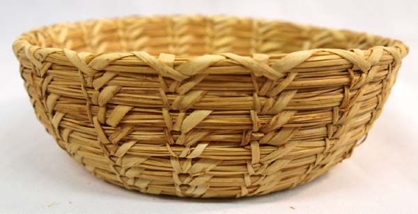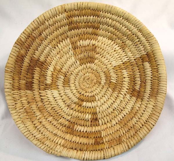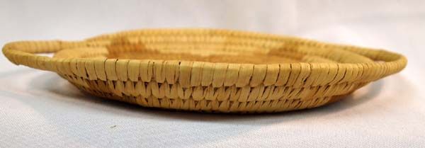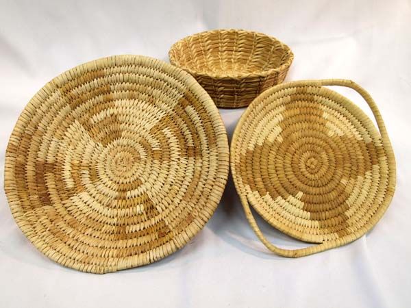 Native American Papago 3 Flat and Shallow Baskets. Three baskets with three different weave design patterns. The deepest bowl has traditional wheat pattern and measures 2.5''Hx7''W. The shallow bowl has a cross pattern and measures 1.5''Hx10.5''W. The flat basket with handles has another cross pattern and measures 8'' diameter without the handles.