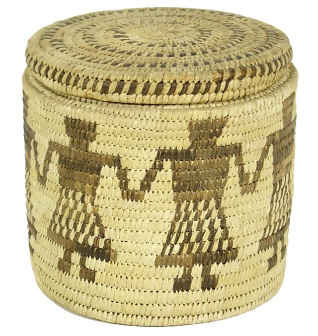 Early/Mid 1900s, Rare well woven lidded basket in cylindrical form depicting 7 human figures holding hands (relished item); very good condition. 7" x 7"