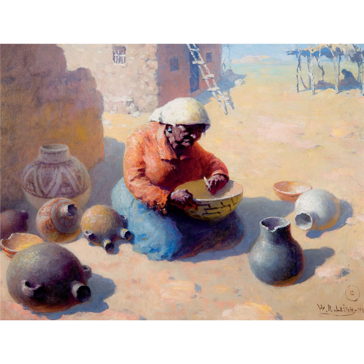 The Papago people, now called by their own name, Tohono O’odham, resides in southern Arizona, south of Phoenix and west of Tucson, and in and northern Sonora, Mexico. Traditional Tohono O’odham pottery was utilitarian, but as tourism came to the Southwest in the 19th century, pottery makers began to embellish their wares for trade. Minerals in the clay create distinctive colors, and the application of various tree pitches and paints form the designs. Mending pottery is as important as making pottery, and Leigh captures the old Tohono woman plying her trade.
